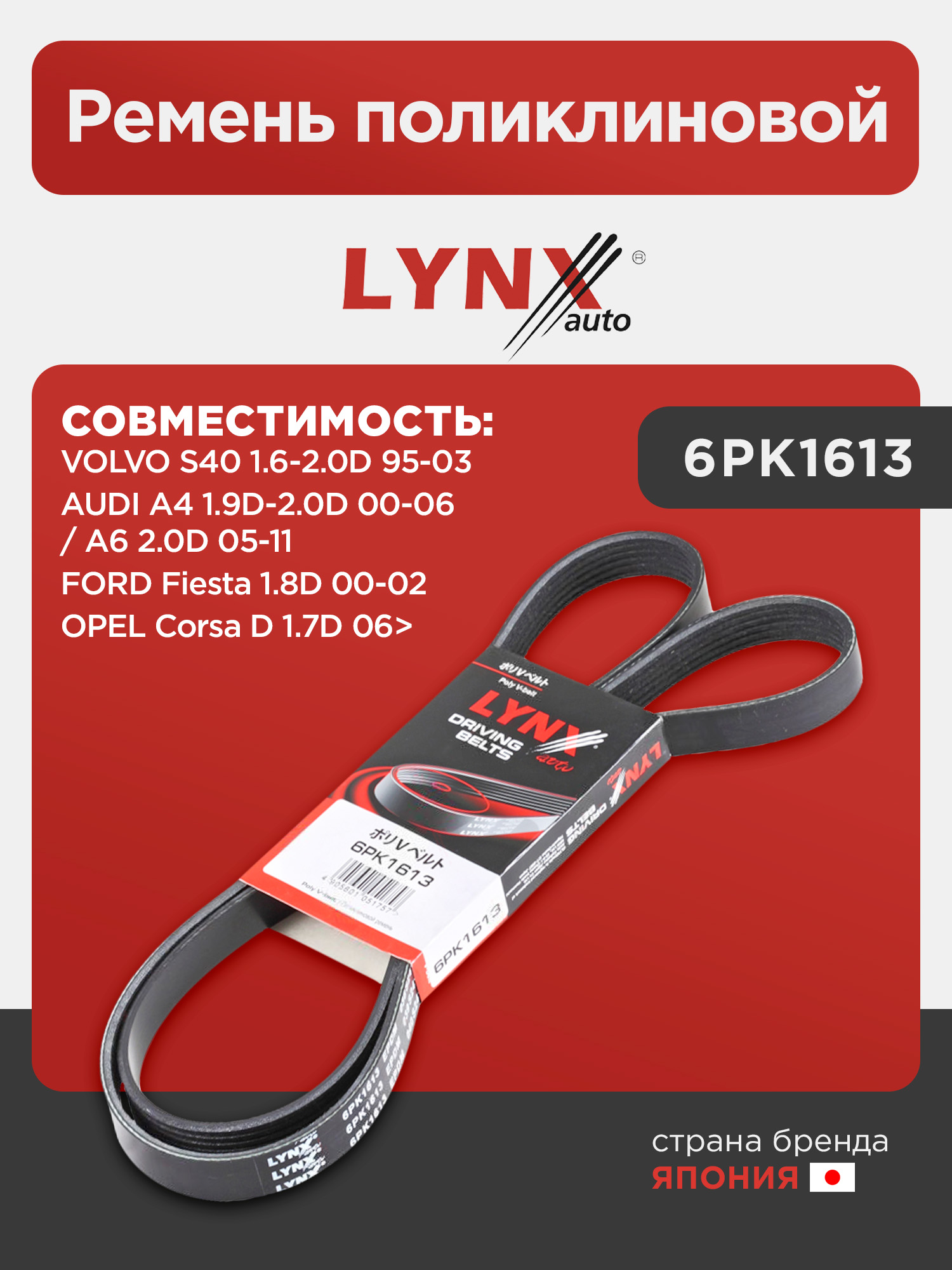 Ремень поликлиновой LYNXauto 6PK1613. Для: AUDI A4 1.9D-2.0D 00-06 / A6 2.0D 05-11, FORD Fiesta 1.8D 00-02, OPEL Corsa D 1.7D 06>, VOLVO S40 1.6-2.0D 95-03