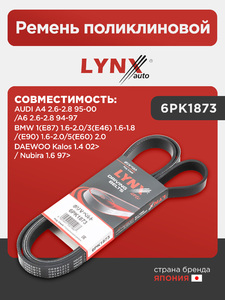 Ремень поликлиновой LYNXauto 6PK1873. Для: Audi, Ауди A4 2.6-2.8 95-00/A6 2.6-2.8 94-97, Bmw, БМВ, 1(E87) 1.6-2.0/3(E46) 1.6-1.8/(E90) 1.6-2.0/5(E60) 2.0, Daewoo, Дэу, Kalos 1.4 02> / Nubira 1.6 97>.
