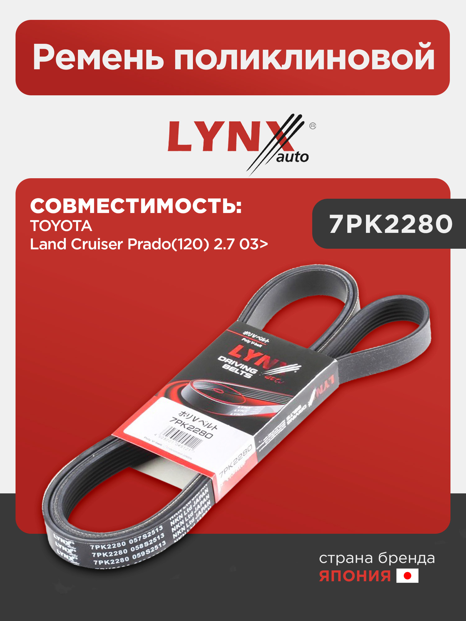 Ремень поликлиновой LYNXauto 7PK2280. Для: TOYOTA Land Cruiser Prado(120) 2.7 03>