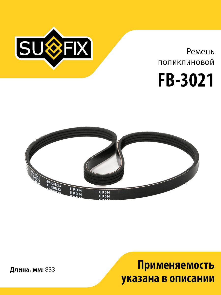 Ремень поликлиновой SUFIX FB-3021. Применение: CHEVROLET Aveo 1.2 06>, HONDA Civic 1.6 16V 91-95, HYUNDAI Accent 1.5 95-00/Getz 1.4 05> / Terracan 2.9D 01>, NISSAN Almera(N15) 1.4 95-00/Micra 1.0-1.4 03> / Primera(P10/11) 1.6-2.0 93-01, SUZULI Liana 1.3/1.6 02> / Swift 1.3-1.5 05> / TOYOTA Avensis 1.6 97-00.