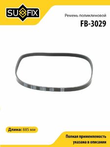 Ремень поликлиновой SUFIX FB-3029. Применение: BMW 3(E46)/7(E65)/X5(E53) 3.0D, KIA Carens 1.6-1.8 00> / Clarus 1.8 96> / Rio 1.3-1.5 00-05/Sephia 1.6 93> / Shuma 1.5-1.8 97-04, OPEL Astra G 1.7TD 98-00, SUBARU Impreza 1.6-2.0 92-00/Legacy 1.8-2.2 >94/2.0-2.5 94-03.