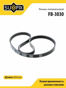 Ремень поликлиновой SUFIX FB-3030. Применение: AUDI 80/100/A6 2.0 92-97, BMW 3(E36) 1.6-1.8/5(E34) 1.8, HYUNDAI Elantra 1.8 00> / i30 07> / Trajet 04> / Tucson 04> 2.0, KIA Ceed 06> / Cerato 04> / Sportage 04> 2.0/Sephia 1.5-1.6 95>, MAZDA 323 1.3-1.6 >04.