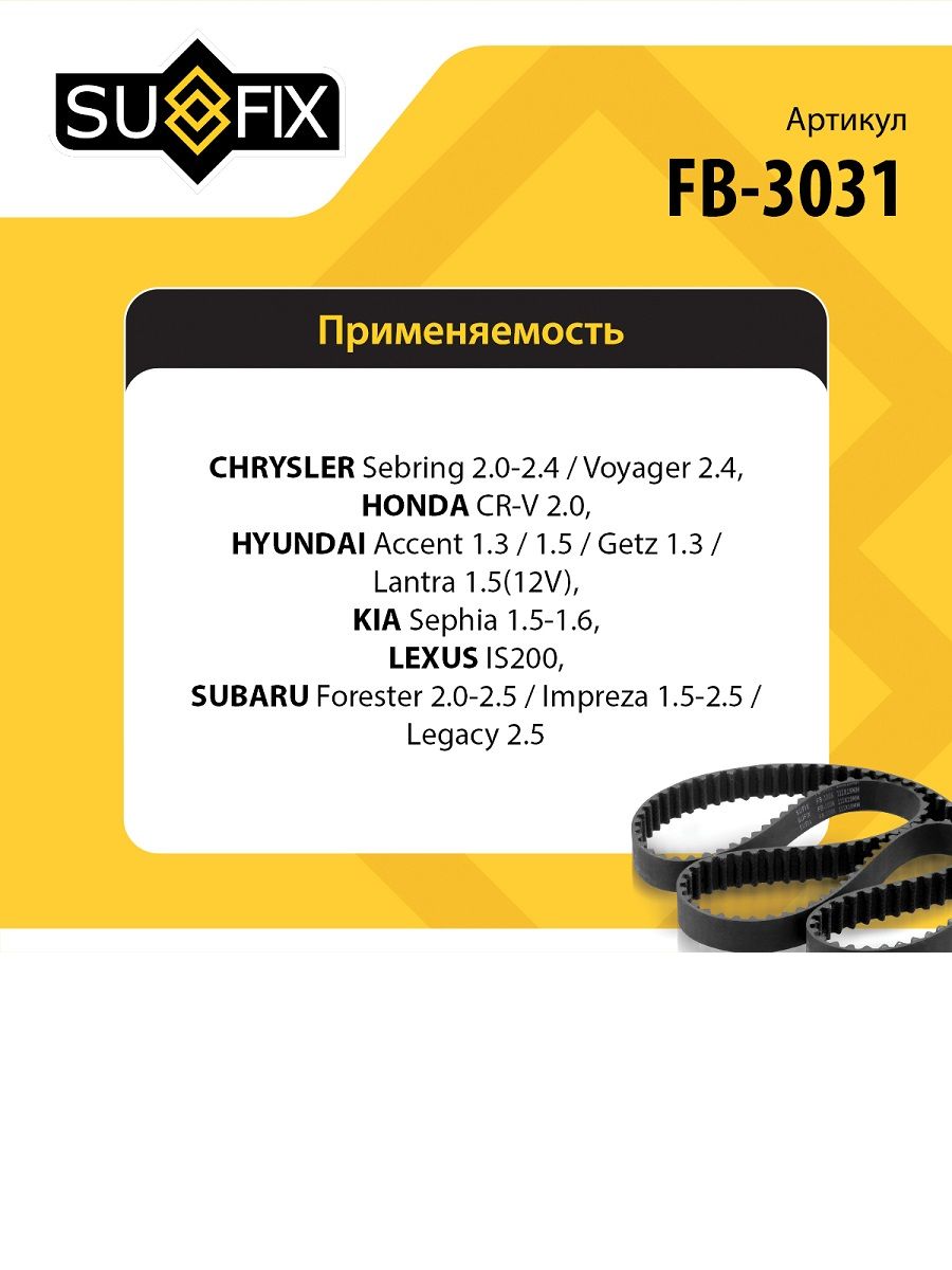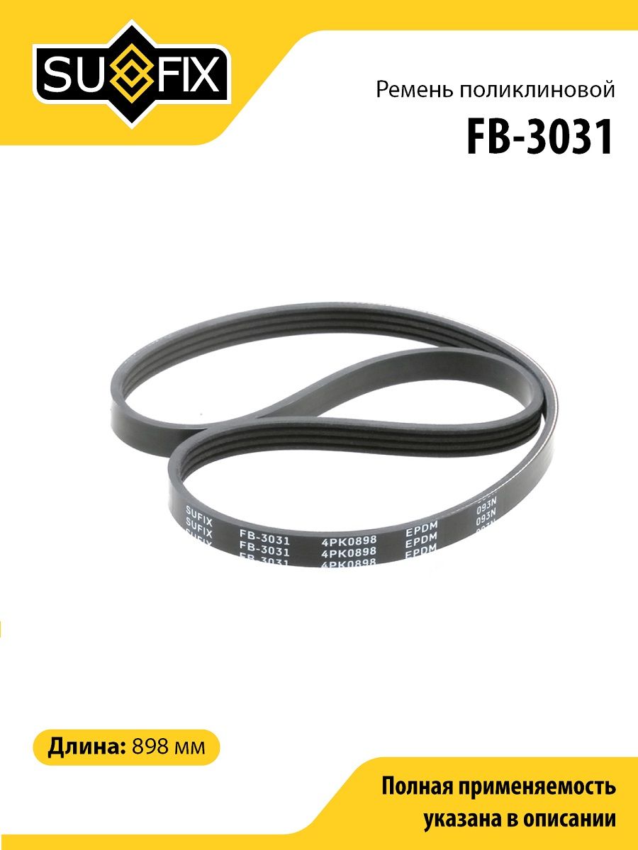 Ремень поликлиновой SUFIX FB-3031. Применение: CHRYSLER Sebring 2.0-2.4 01> / Voyager 2.4 00>, HONDA CR-V 2.0 99-02, HYUNDAI Accent 1.3/1.5 94-00/Getz 1.3 02> / Lantra 1.5 96-00(12V), KIA Sephia 1.5-1.6 95>, LEXUS IS200 99-05, SUBARU Forester 2.0-2.5 98> / Impreza 1.5-2.5 00> / Legacy 2.5 92-03.