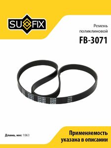 Ремень поликлиновой SUFIX FB-3071. Применение: AUDI TT 2.5T 09>, FIAT Croma 1.9TD >96, MAZDA 626 1.8-2.2 >97, MITSUBISHI Colt 1.3 00-05/ Lancer 1.3-1.6 03> / Space Star 1.3 98>, VW Jetta III 2.5T 06>.