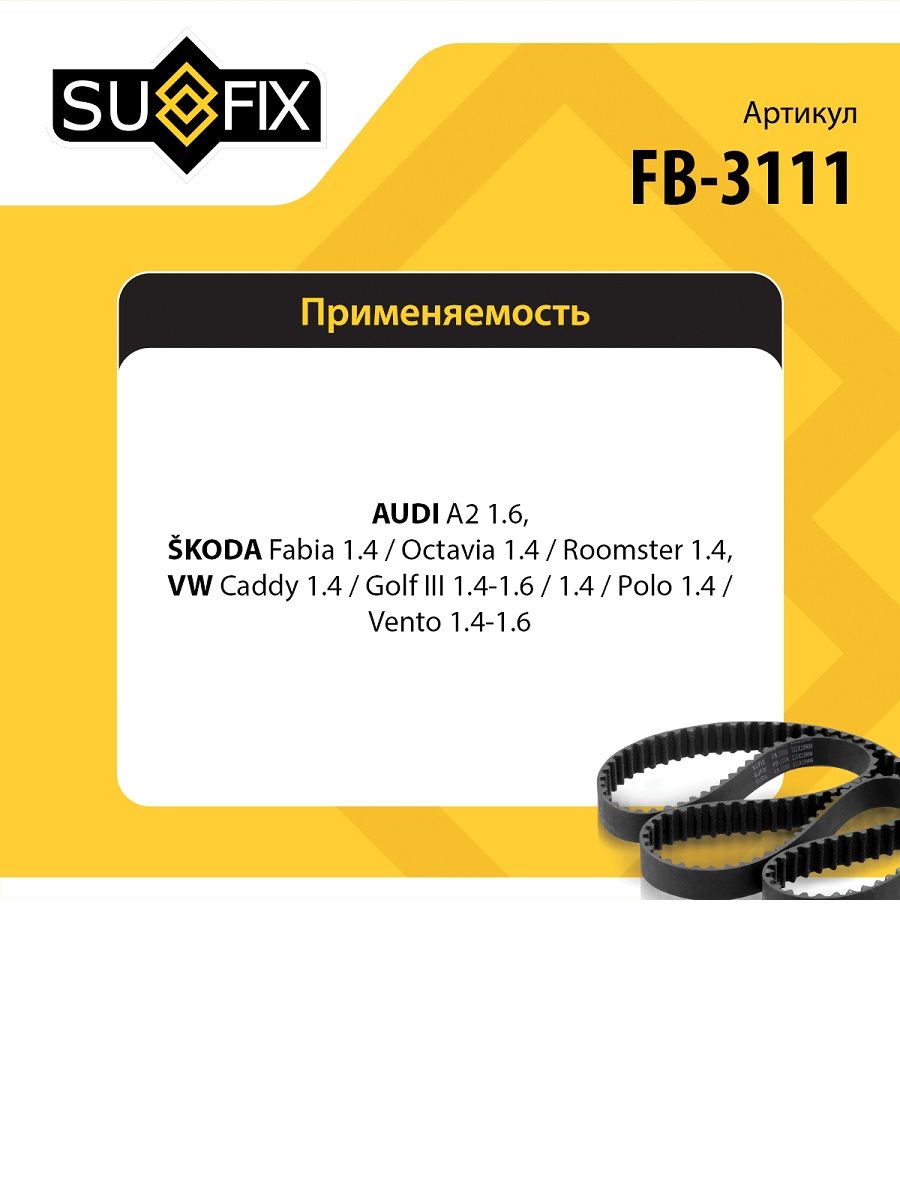 Ремень поликлиновой SUFIX FB-3111. Применение: AUDI A2 1.6 02-05, SKODA Fabia 1.4 99> / Octavia 1.4 00> / Roomster 1.4 06>, VW Caddy 1.4 04> / Golf III 1.4-1.6 91-97 / V-VI 1.4 03> / Polo 1.4 01> / Vento 1.4-1.6 91-98 .