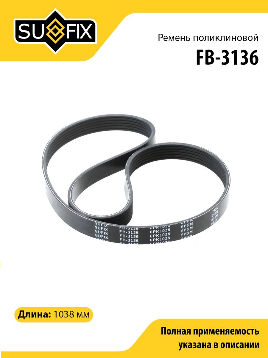 Ремень поликлиновой SUFIX FB-3136. Применение: ALFA ROMEO 145/146/147/156 1.9D, CITROEN Berlingo 1.9D 98>, LEXUS RX300 00>, TOYOTA Camry 3.0 01>.