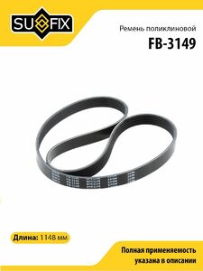 Ремень поликлиновой SUFIX FB-3149. Применение: FIAT Ducato 1.9D 98-02, FORD Galaxy 1.9D 95-06, MITSUBISHI Galant 2.5 92-96, PEUGEOT 307 1.4-1.6 94-01/Boxer 1.9D 94-02, SUZUKI Vitara 1.9D 95-99, VW Caddy 1.9D 95-04/Golf 1.9TD 93-02/Passat 1.9D 91-97/Sharan 1.9D 96-00/Vento 1.9D.