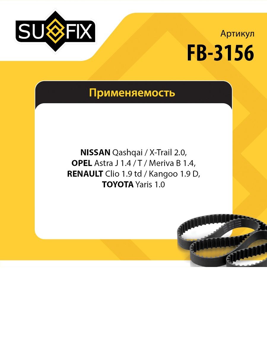 Ремень поликлиновой SUFIX FB-3156. Применение: NISSAN Qashqai/X-Trail 2.0 07>, OPEL Astra J 1.4/T 09> / Meriva B 1.4 10>, RENAULT Clio 1.9 td 99-05/Kangoo 1.9 D 03>, TOYOTA Yaris 1.0 06>.