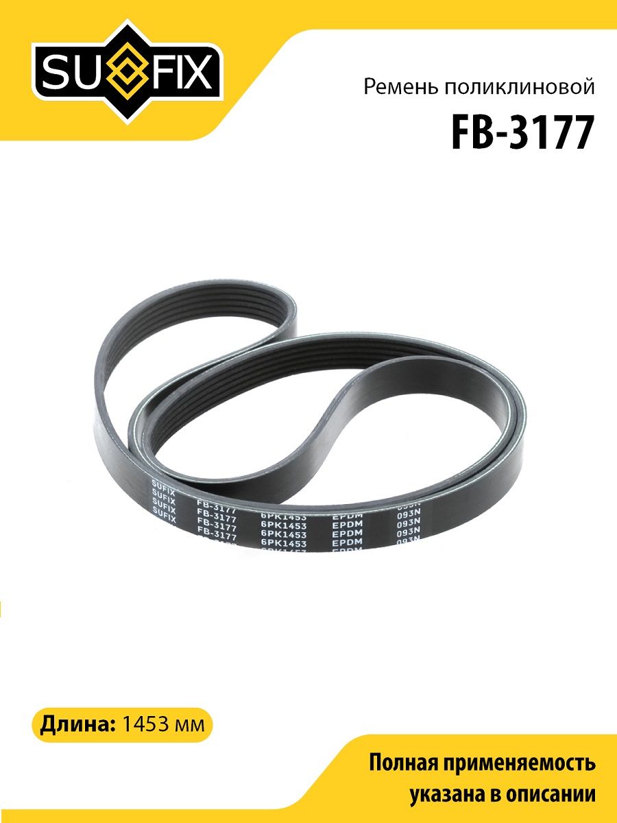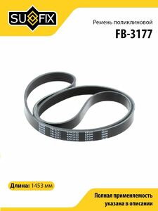 Ремень поликлиновой SUFIX FB-3177. Применение: CHEVROLET Cruze 1.6-1.8 09>, CITROEN Berlingo 1.1-1.6 96> / C5 2.0D 01-04, OPEL Astra J 1.6-T 09> / Insignia 1.6-1.8 08>, PEUGEOT 206 1.4-1.6 07 / Partner 1.1-1.6 96>, SKODA Fabia 1.2 06>, VW Polo 1.2 05> .