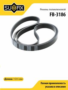 Ремень поликлиновой SUFIX FB-3186. Применение: BMW 3(E36)/5(E34/39) 2.0-2.8, CHEVROLET Cruze 1.6-1.8 09>, FORD Focus III 1.6T 11>, Mondeo 1.6T 11>, OPEL Astra 1.6T 09>, VW Transporter 5 2.0D 09>.