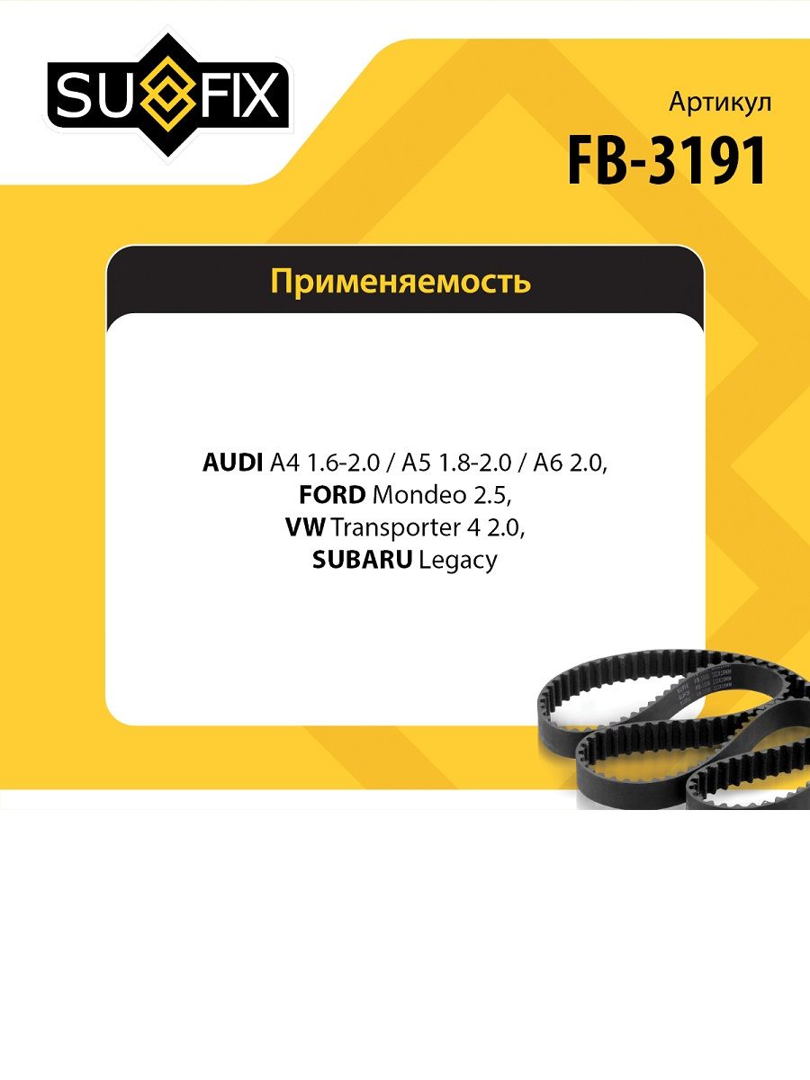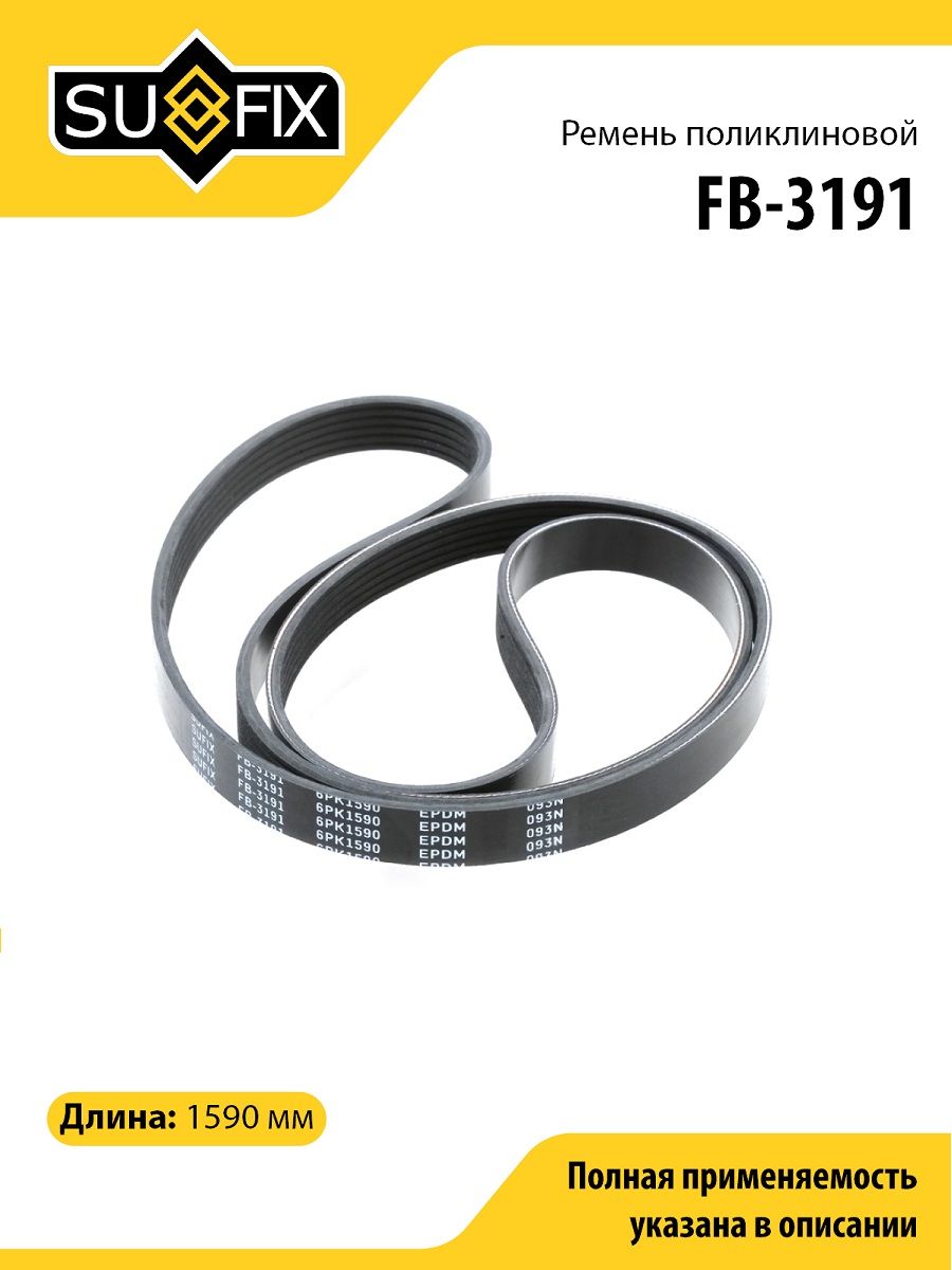 Ремень поликлиновой SUFIX FB-3191. Применение: AUDI A4 1.6-2.0 00-04/A5 1.8-2.0 09> / A6 2.0 01-05, FORD Mondeo 2.5 94-00, VW Transporter 4 2.0 90-03, SUBARU Legacy 03>.