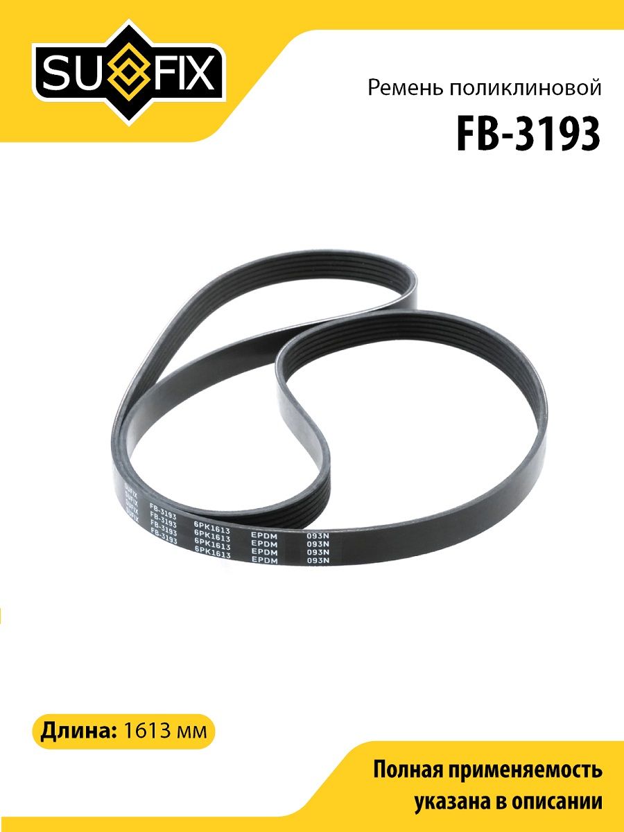 Ремень поликлиновой SUFIX FB-3193. Применение: AUDI A4 1.9D-2.0D 00-06 / A6 2.0D 05-11, FORD Fiesta 1.8D 00-02, OPEL Corsa D 1.7D 06>, VOLVO S40 1.6-2.0D 95-03.