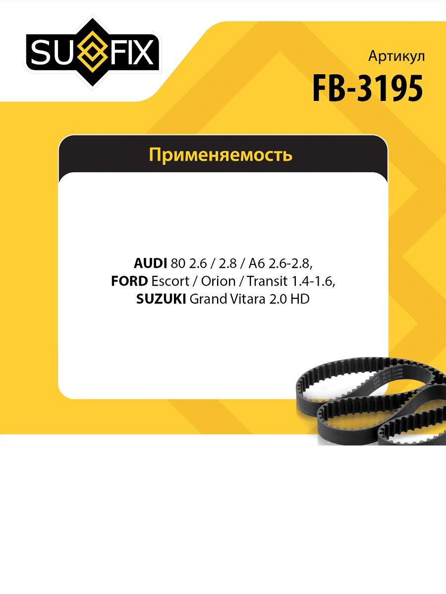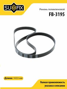 Ремень поликлиновой SUFIX FB-3195. Применение: AUDI 80 2.6/2.8 92-95/A6 2.6-2.8 94-97, FORD Escort/Orion/Transit 1.4-1.6 90-94, SUZUKI Grand Vitara 2.0 HD 01>.