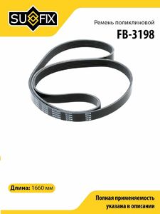 Ремень поликлиновой SUFIX FB-3198. Применение: AUDI A3 1.9TD 96-01, BMW 3(E36) 1.6-1.8, CITROEN Xantia 93>, Xsara 1.8 97-00/ZX 91-97, PEUGEOT 306 94> / 405 92-95, RENAULT Laguna 93-01/Megane 95>, SKODA Octavia 1.9TD, VW Bora/Golf IV.