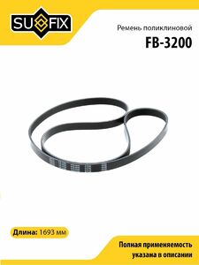 Ремень поликлиновой SUFIX FB-3200. Применение: AUDI 100 2.3 90-94/A1/A3 1.2T 10> / A6 2.3 94-97, HYUNDAI Santa Fe 2.7 01> / Tucson 2.7>, KIA Sportage 2.7 04>, SCODA Octavia/Roomster 1.2TSI 10>, VW Golf VI 1.2T 09-/Transporter 4 2.5TD 98-03.