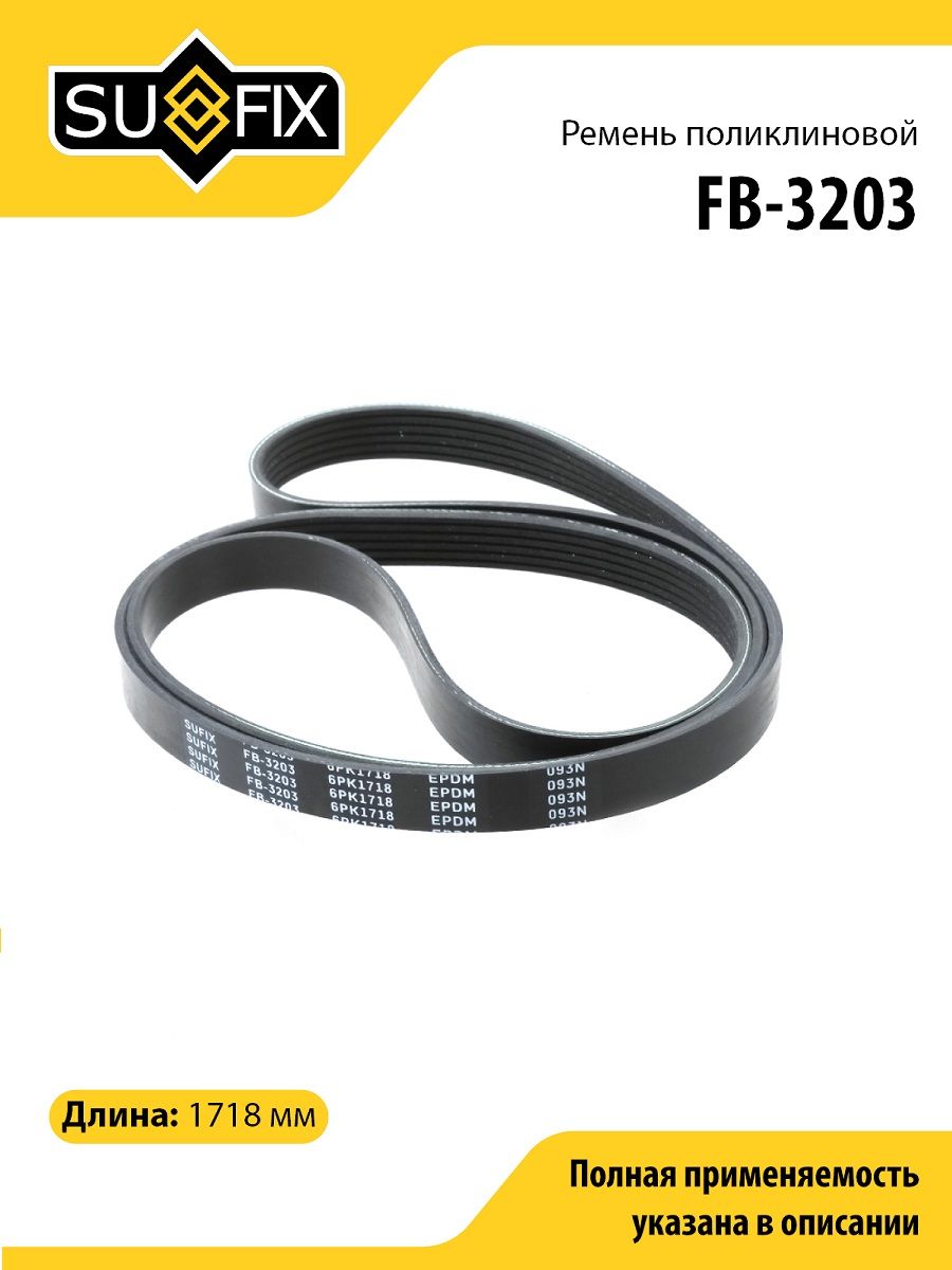 Ремень поликлиновой SUFIX FB-3203. Применение: FORD Focus 1.8D 99-04 / Mondeo 1.6-2.0 93-00 / Tourneo 1.8D-TD 02> / Transit 1.8D-TD 02>, JEEP Compass / Patriot 2.0D 06>, MITSUBISHI Grandis 2.0D 05> / Lancer 2.0D 08>, OPEL Astra J 1.7TD 09> / Corsa 1.7TD 10> / Meriva B 1.7TD 10>, SUZUKI Liana 1.4D 04>, VW LT 2.5D-TD 96-06 / Transporter 2.4D02.5 90-03.