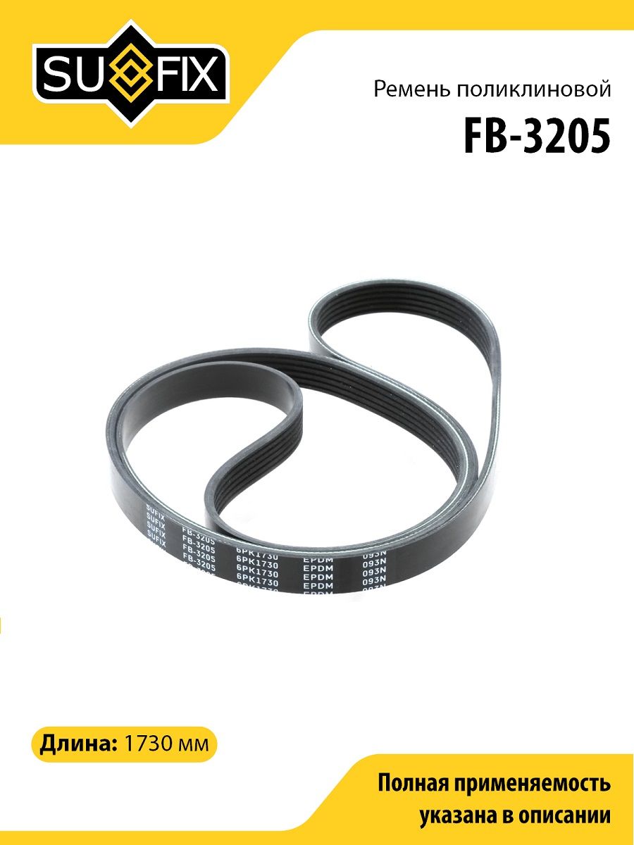 Ремень поликлиновой SUFIX FB-3205. Применение: CHRYSLER Sebring 2.0D 07>, TOYOTA Avensis(T25) 1.6-1.8 03>.