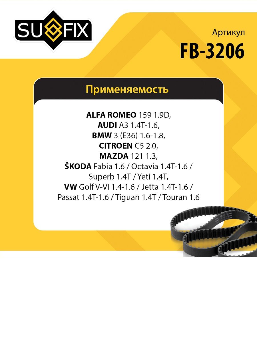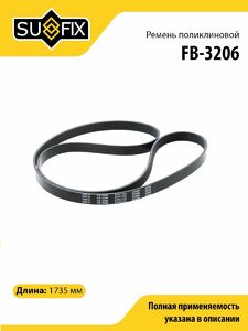 Ремень поликлиновой SUFIX FB-3206. Применение: ALFA ROMEO 159 1.9D 05>, AUDI A3 1.4T-1.6 03>, BMW 3(E36) 1.6-1.8 93-98, CITROEN C5 2.0 01-04, MAZDA 121 1.3 96>, SKODA Fabia 1.6 07> / Octavia 1.4T-1.6 04> / Superb 1.4T 08> / Yeti 1.4T 10>, VW Golf V-VI 1.4-1.6 03> / Jetta 1.4T-1.6 05-10 / Passat 1.4T-1.6 05> / Tiguan 1.4T 10> / Touran 1.6 03-07.