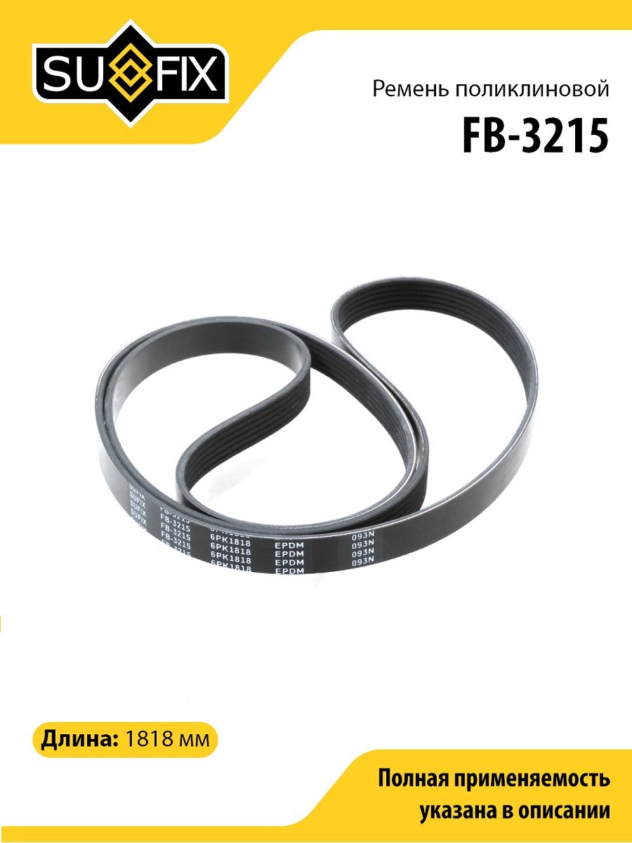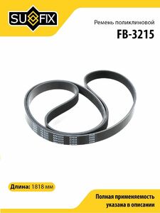Ремень поликлиновой SUFIX FB-3215. Применение: FIAT Doblo 1.9TD 01>, FORD Escort 1.6-1.8 90-95/Mondeo II 2.5 96-00/Scorpio 2.0 >94/Sierra 2.0 90-93, RENAULT Laguna 1.6 05> / Logan 1.6 07>, TOYOTA Corolla 1.4-1.6 00-02.