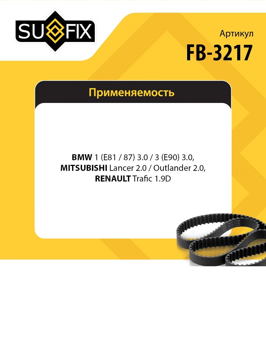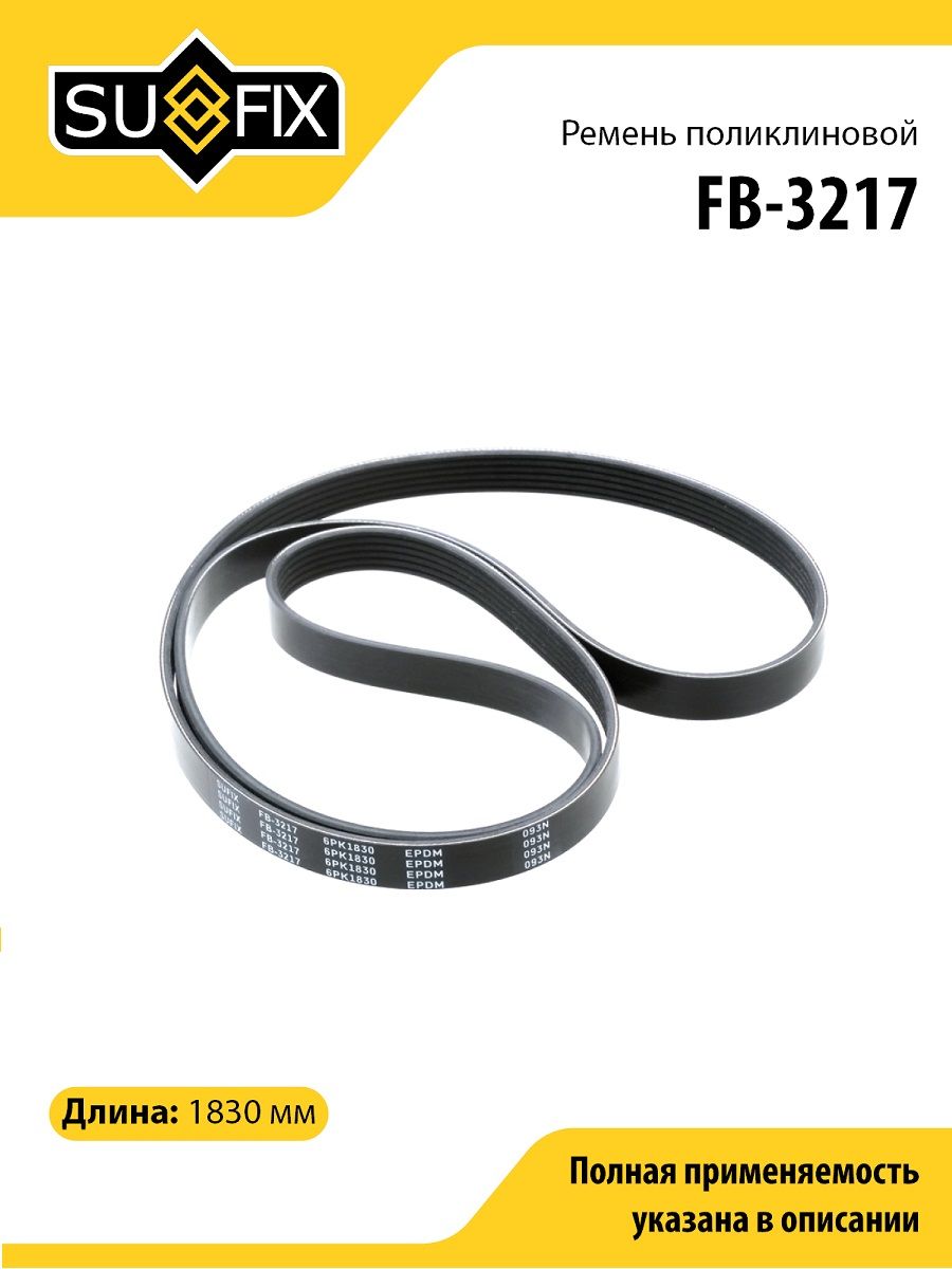 Ремень поликлиновой SUFIX FB-3217. Применение: BMW 1(E81 / 87) 3.0 05> / 3(E90) 3.0 07>, MITSUBISHI Lancer 2.0 03> / Outlander 2.0 03>, RENAULT Trafic 1.9D 01>.