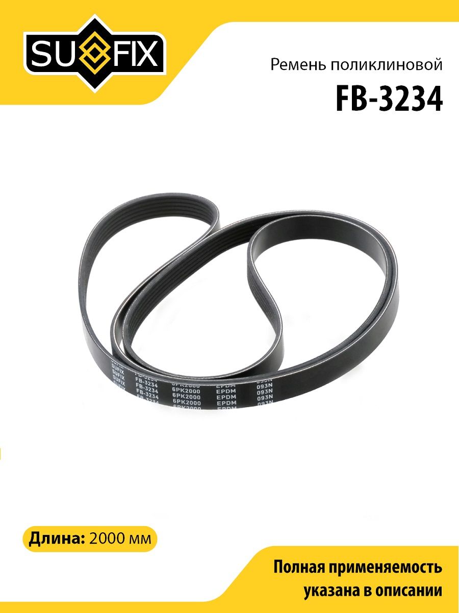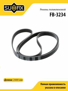 Ремень поликлиновой SUFIX FB-3234. Применение: HYUNDAI Sonata 2.5 98-01/2.7 01> / Tucson 2.7 04>, KIA Sportage 2.7 04>, SAAB 9-5 2.0-2.3T 97>, VW Transporter 4 2.5 90-03.