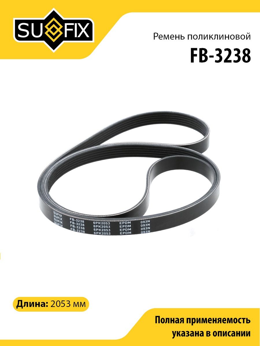Ремень поликлиновой SUFIX FB-3238. Применение: CHRYSLER Voyager 2.5TD-3.0 95-01, HYUNDAI Santa Fe 2.7 05>, KIA Magentis 2.7 05>, MERCEDES-BENZ C180-220D(W202) 94-00, SSANGYONG Korrado/Rexton/Musso 2.0-2.3 97>.