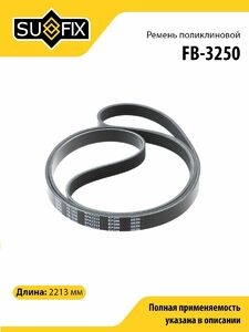 Ремень поликлиновой SUFIX FB-3250. Применение: MAZDA 6(GG) 2.3 02-07, MERCEDES-BENZ C350(W204) 11> / Sprinter 2.1D-2.3 00> / Viano 2.0-2.2 10> / Vito 2.1D 10>, VOLVO S80 2.0 08>, VW LT 2.3 96-06 / Transporter 2.5D 95-03.