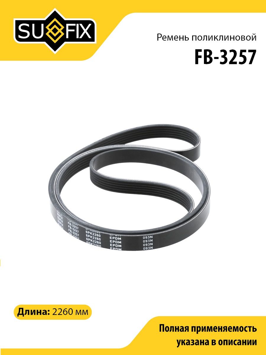 Ремень поликлиновой SUFIX FB-3257. Применение: AUDI 80/100 2.6-2.8 92-94, JEEP Grand Cherokee 4.7 04>, MAZDA 6 1.8-2.0 02>, MERCEDES-BENZ C200D-270D(W203) 00> / C200D-220D(W204) 07> / E200D-320D(W211) 02> / Sprinter 2.2TD 00> / 2.7D 00-06.
