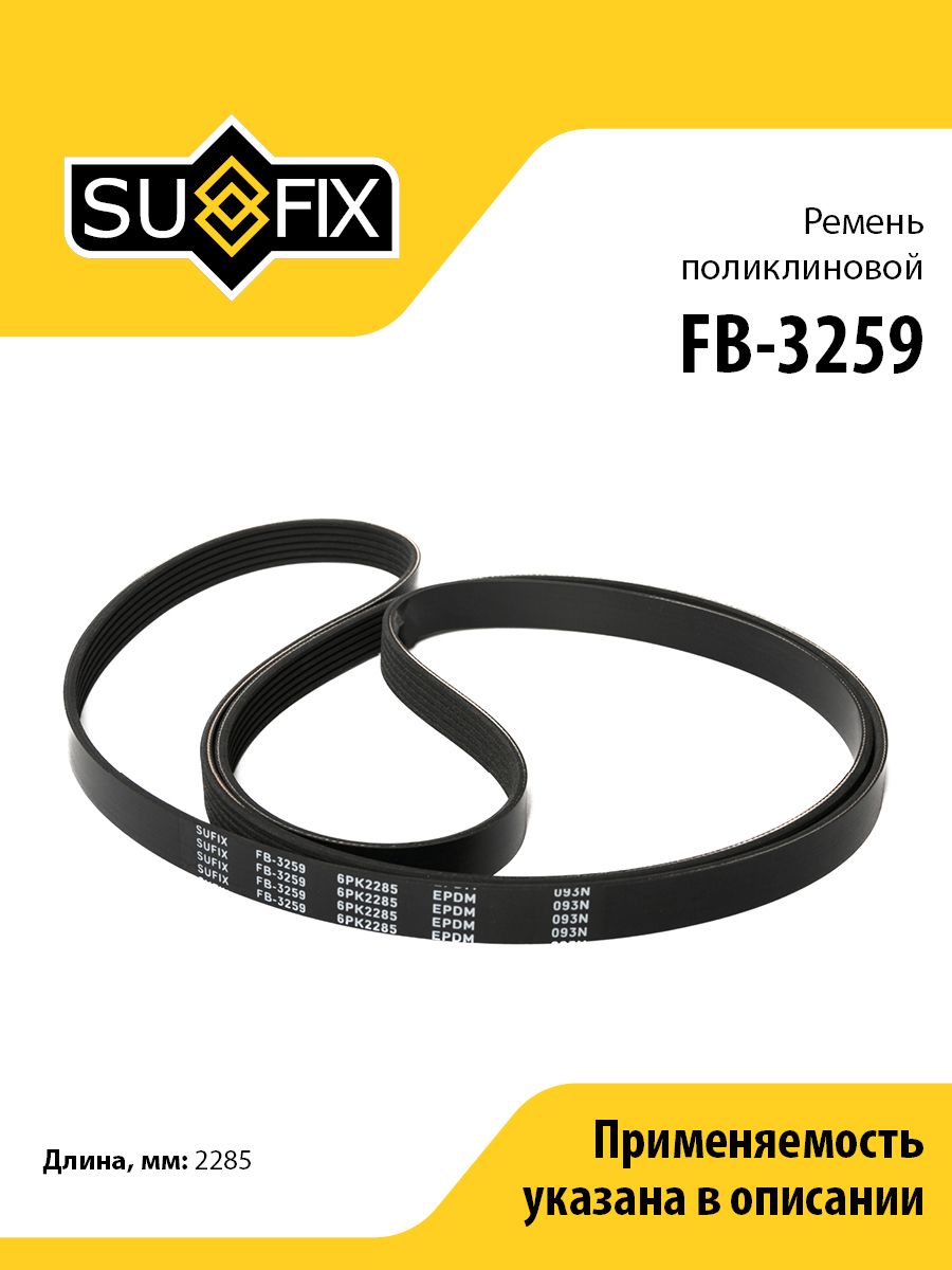 Ремень поликлиновой SUFIX FB-3259. Применение: AUDI 100 2.8 90-94, ISUZU Trooper 2.5 00>, MAZDA 6 2.0-2.5 07> / CX-7 2.3T 07>, MERCEDES-BENZ Sprinter 06> / Viano/Vito 2.0D-2.2D 03>, OPEL Frontera B 3.2 98> / Monterey B 3.5 98-99.