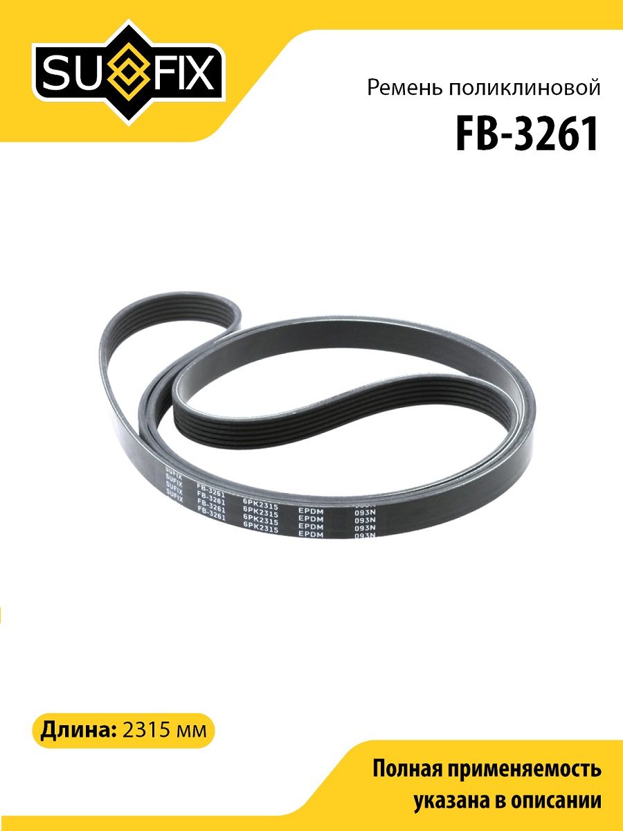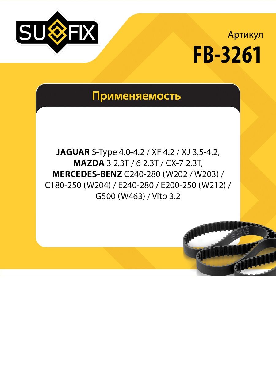 Ремень поликлиновой SUFIX FB-3261. Применение: JAGUAR S-Type 4.0-4.2 99-07 / XF 4.2 08> / XJ 3.5-4.2 03-09, MAZDA 3 2.3T 06-09 / 6 2.3T 05-07 / CX-7 2.3T 09>, MERCEDES-BENZ C240-280(W202/W203) 97-07 / C180-250(W204) 07> / E240-280 97-02 / E200-250(W212) 09> / G500(W463) 98> / Vito 3.2 03>.