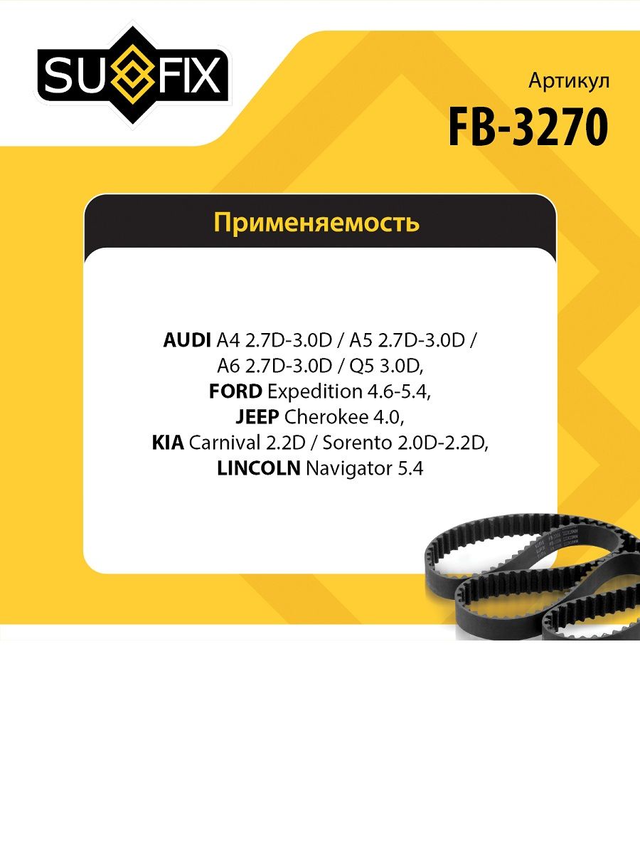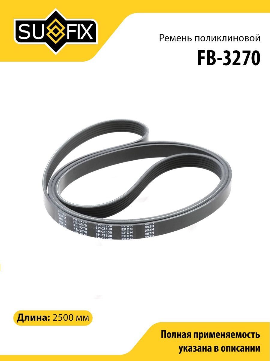 Ремень поликлиновой SUFIX FB-3270. Применение: AUDI A4 2.7D-3.0D 07> / A5 2.7D-3.0D 07> / A6 2.7D-3.0D 04-11 / Q5 3.0D 08>, FORD Expedition 4.6-5.4 96-02, JEEP Cherokee 4.0 95-01, KIA Carnival 2.2D 10> / Sorento 2.0D-2.2D 09>, LINCOLN Navigator 5.4 97-02.
