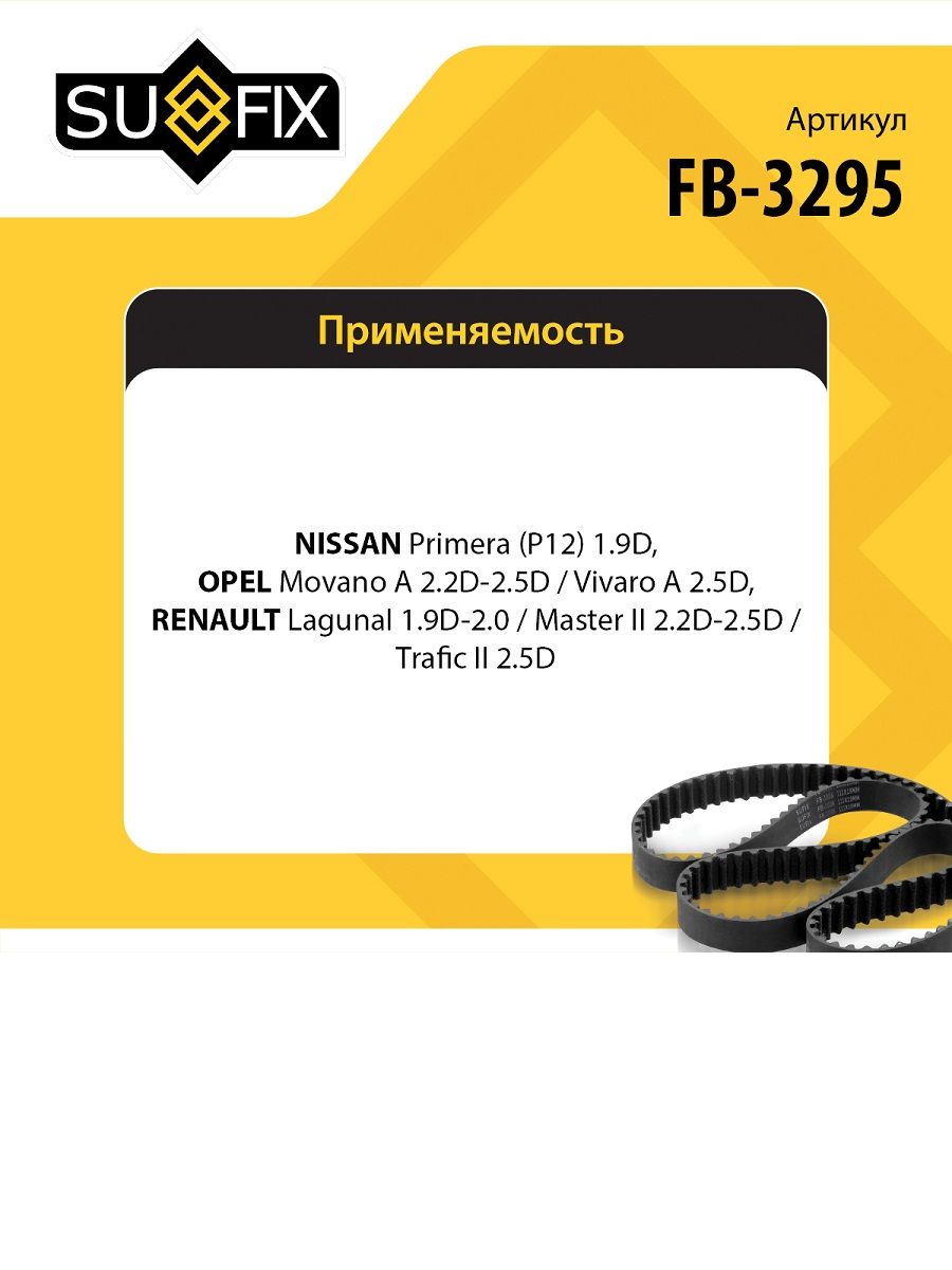 Ремень поликлиновой SUFIX FB-3295. Применение: NISSAN Primera(P12) 1.9D 02-07, OPEL Movano A 2.2D-2.5D 00> / Vivaro A 2.5D 06>, RENAULT Laguna II-III 1.9D-2.0 01> / Master II 2.2D-2.5D 00> / Trafic II 2.5D 07>.
