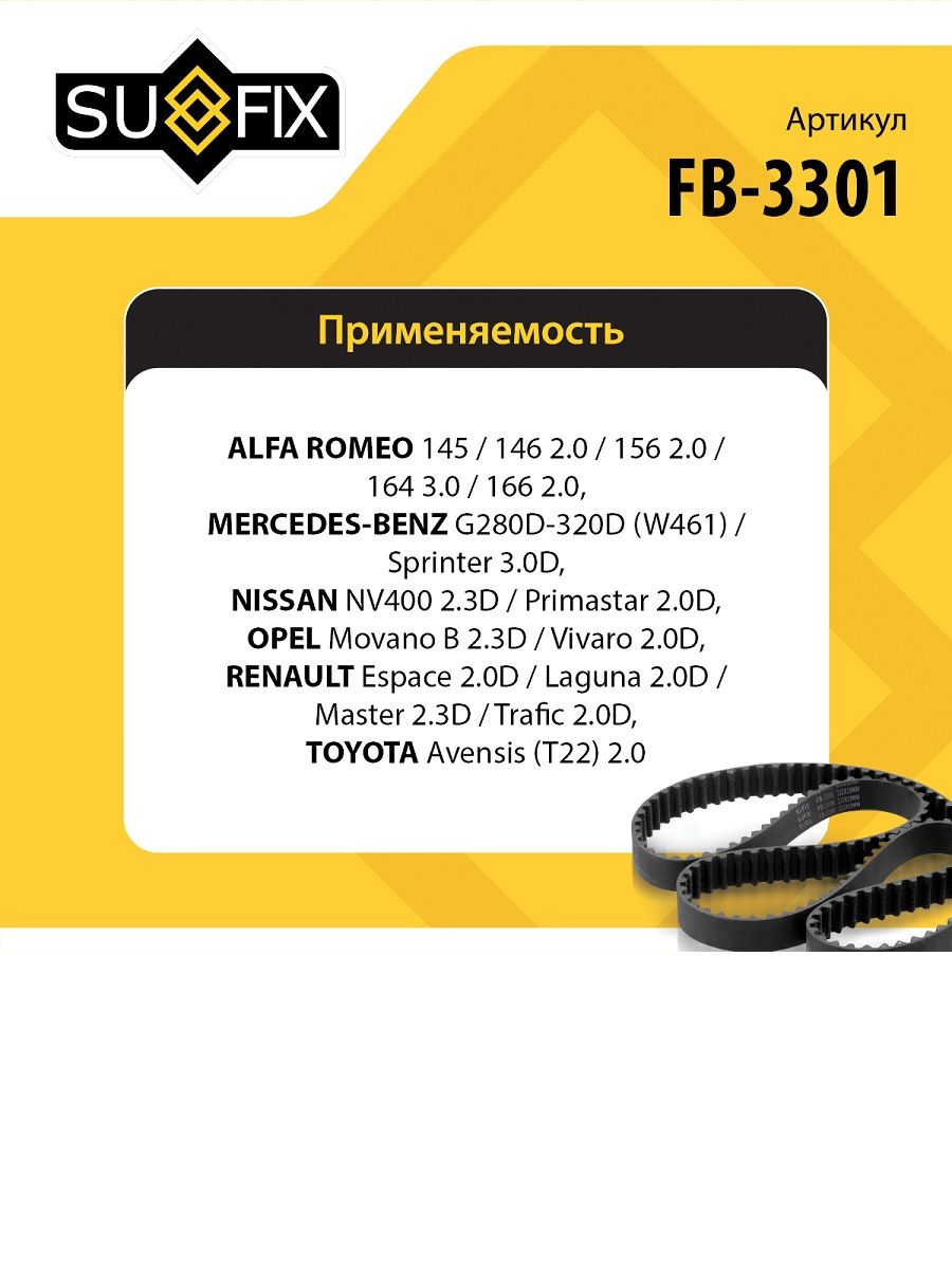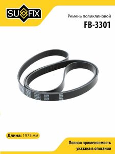 Ремень поликлиновой SUFIX FB-3301. Применение: ALFA ROMEO 145 / 146 2.0 98-01 / 156 2.0 97-00 / 164 3.0 92-98 / 166 2.0 95-05, MERCEDES-BENZ G280D-320D(W461) 09> / Sprinter 3.0D 06>, NISSAN NV400 2.3D 11> / Primastar 2.0D 06>, OPEL Movano B 2.3D 10> / Vivaro 2.0D 06>, RENAULT Espace 2.0D 06> / Laguna 2.0D 06> / Master 2.3D 11> / Trafic 2.0D 06>, TOYOTA Avensis(T22) 2.0 00-03.