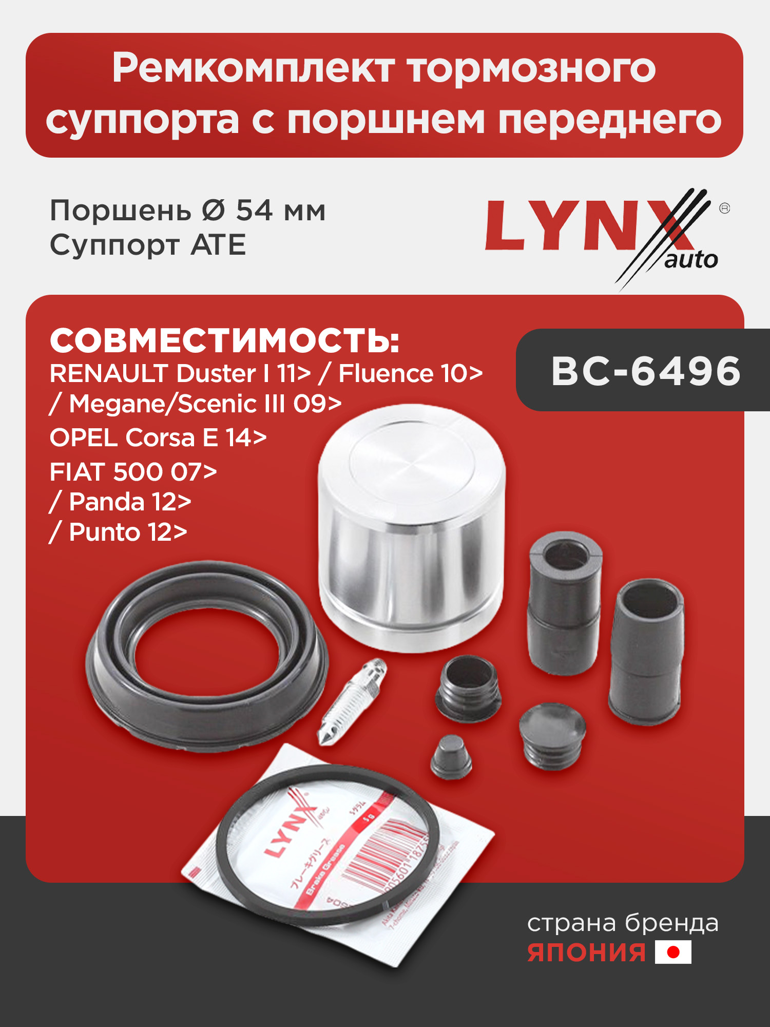 Ремкомплект тормозного суппорта с поршнем переднего (поршень Ø 54 mm, суппорт ATE) LYNXauto BC-6496. Применение: RENAULT Duster I 11> / Fluence 10> / Megane/Scenic III 09>, FIAT 500 07> / Panda 12> / Punto 12>, OPEL Corsa E 14>.