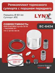 Ремкомплект тормозного суппорта с поршнем переднего (поршень Ø 60 mm, суппорт ATE) LYNXauto BC-6434. Применение: MERCEDES-BENZ Sprinter 95-06 / Vito(W638) 97>, VW LT 28-46 II 96-06.