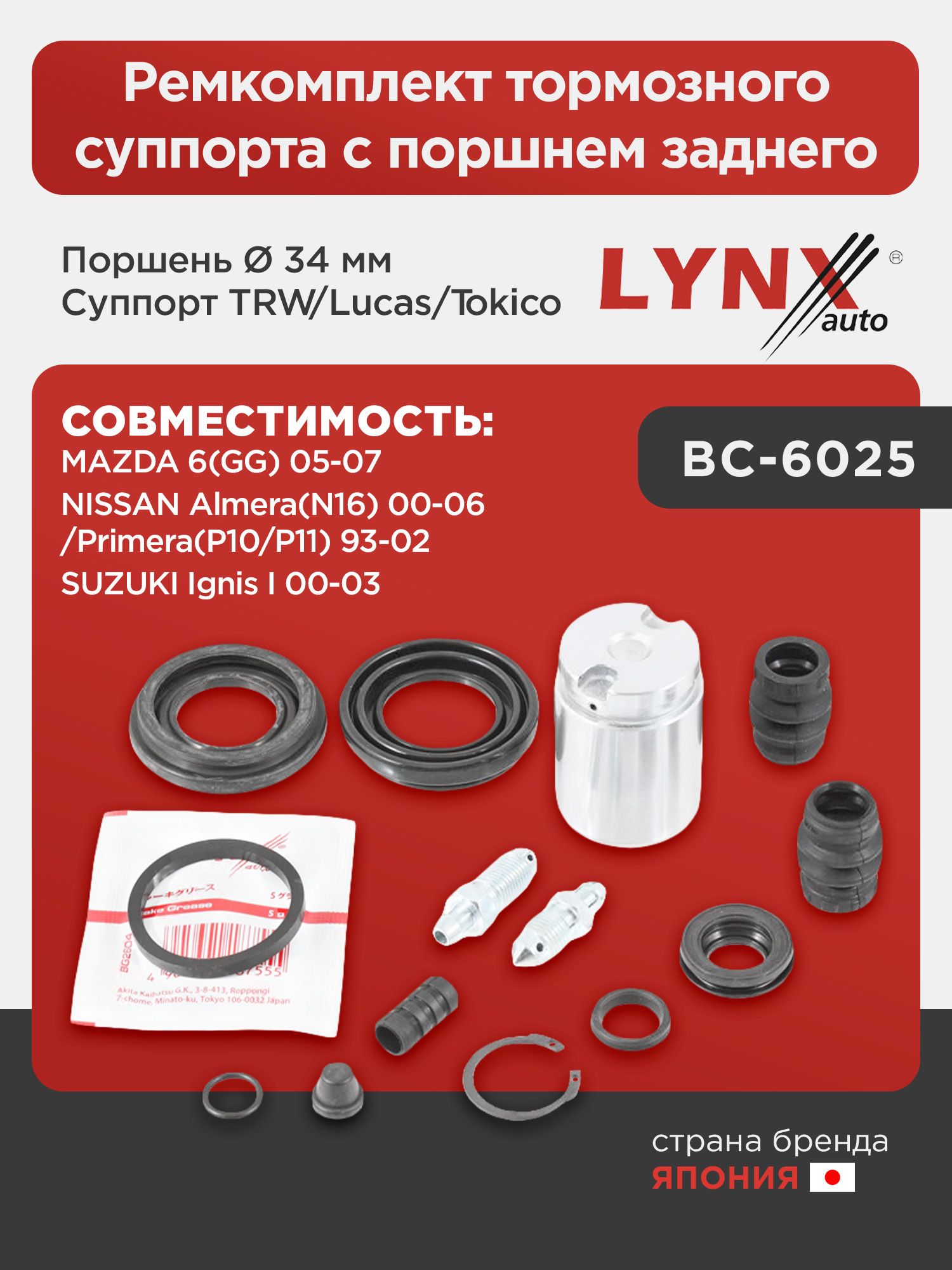 Ремкомплект тормозного суппорта с поршнем заднего (поршень Ø 34 mm, суппорт TRW/Lucas/Tokico) LYNXauto BC-6025. Для MAZDA Мазда 6(GG) 05-07, NISSAN Ниссан Almera(Алмера)(N16) 00-06/Primera(Примера)(P10/P11) 93-02, SUZUKI Сузуки Ignis I 00-03