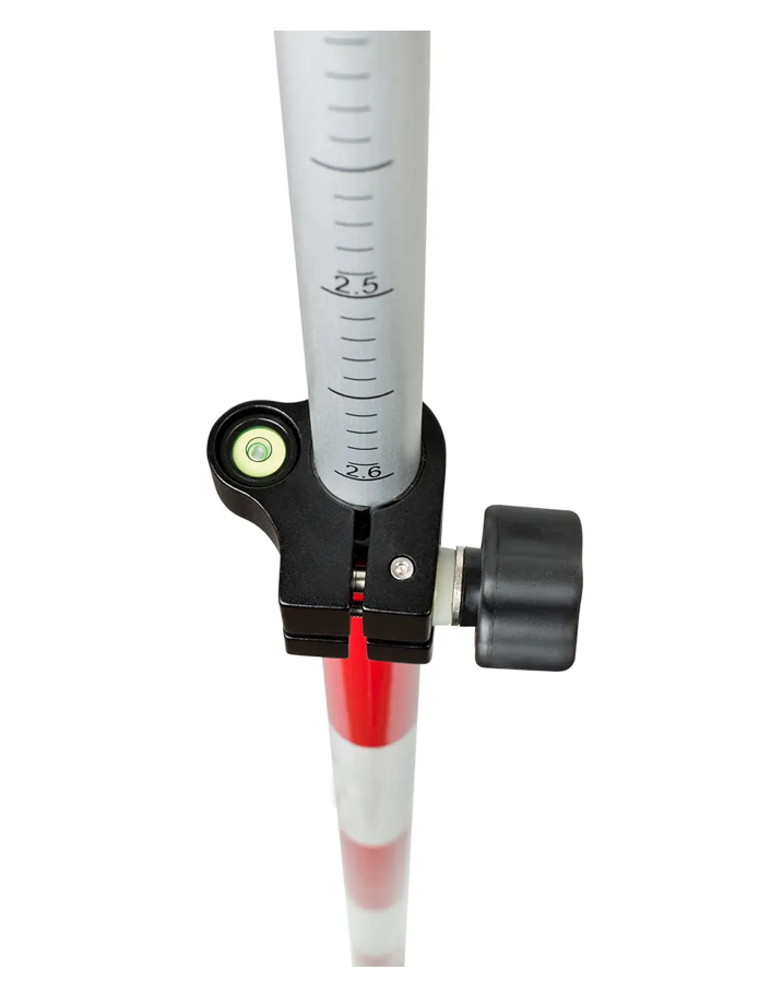 Винтовой зажим надёжен и практически не изнашивается со временем, обеспечивая прочное закрепление выдвижного элемента вехи в течение всего срока службы.