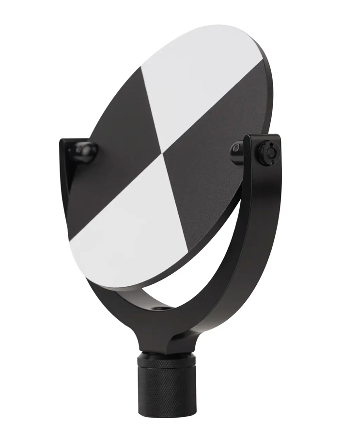 - Увеличенный размер черно-белой мишени позволяет использовать геодезический отражатель при съемке с больших дистанций, размещая ее в зонах перекрытия сканов для минимизации количества съемочных позиций.