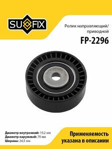 Ролик направляющий/приводной SUFIX FP-2296. Применение: BMW 3(E36/46) 1.6-3.2 90-05/5(E34-60) 1.8-3.0 89-10/7(E38) 2.8 95-01/7(E65-67) 3.0 03>/X3(E83) 2.5-3.0 04>/X5(E53) 3.0 00>/Z3(E36) 1.8-3.2 99-03/Z4(E85) 2.2-3.2 03>, SKODA Felicia 1.3 94-02.