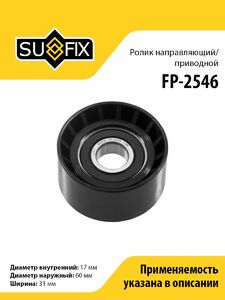 Ролик направляющий/приводной SUFIX FP-2546. Применение: MITSUBISHI Carisma 1.9D 96-00/Space Star 1.9D 01>, NISSAN Almera(G15) 1.6 12>/Primera(P12) 1.9D 02>, OPEL Movano 1.9D-2.5D 01>/Vivaro 1.9D-2.5D 01>, RENAULT Duster 2.0 12>/Laguna II 1.8-2.0 01>/Master II 2.2D-2.5D 01>/Traffic II 1.9D-2.5D 01>, VOLVO S40 I 1.9D 00-04.