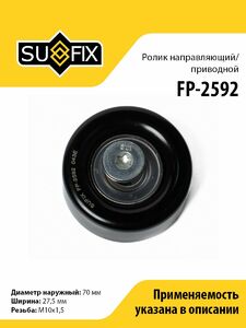 Ролик направляющий/приводной SUFIX FP-2592. Применение: HYUNDAI Accent(LC) 1.5D 02>/Elantra(XD) 2.0D 01>/Getz 1.5D 03-05/Grandeur 2.2D 06>/i30 2.0D 07-11/Matrix 1.5D 01-10/Santa Fe(CM/SM) 2.0D-2.2D 01>/Sonata(NF) 2.0D 06>/Trajet 2.0D 01-08/Tucson(JM) 2.0D 04>, KIA Carens II-III 2.0D 02>/Magentis 2.0D 05>/Cerato/Spectra(LD) 2.0D 04>/Sportage(JE) 2.0D 04>.