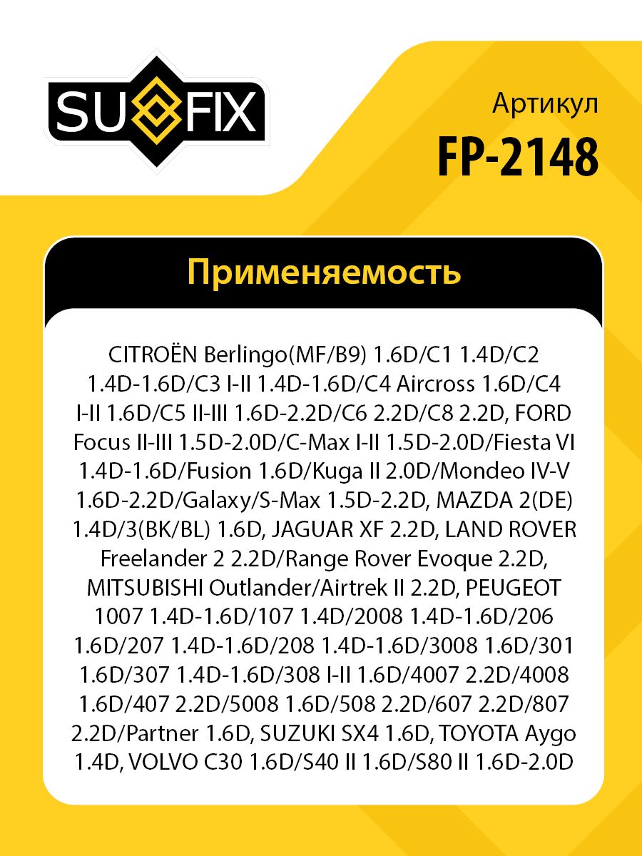 Ролик натяжного механизма/приводной SUFIX FP-2148. Применение: CITROEN Berlingo(MF/B9) 1.6D 98>/C1 1.4D 05>/C2 1.4D-1.6D 03>/C3 I-II 1.4D-1.6D 02>/C4 Aircross 1.6D 12>/C4 I-II 1.6D 04>/C5 II-III 1.6D-2.2D 06>/C6 2.2D 06>/C8 2.2D 06>, FORD Focus II-III 1.5D-2.0D 04>/C-Max I-II 1.5D-2.0D 07>/Fiesta VI 1.4D-1.6D 09>/Fusion 1.6D 04-12/Kuga II 2.0D 14>/Mondeo IV-V 1.6D-2.2D 07>/Galaxy/S-Max 1.5D-2.2D 08>, MAZDA 2(DE) 1.4D 08-15/3(BK/BL) 1.6D 04-13, JAGUAR XF 2.2D 11-15, LAND ROVER Freelander 2 2.2D 06-14/Range Rover Evoque 2.2D 11>, MITSUBISHI Outlander/Airtrek II 2.2D 07-12, PEUGEOT 1007 1.4D-1.6D 05>/107 1.4D 05>/2008 1.4D-1.6D 13>/206 1.6D 04>/207 1.4D-1.6D 06>/208 1.4D-1.6D 12>/3008 1.6D 09>/301 1.6D 12>/307 1.4D-1.6D 01>/308 I-II 1.6D 07>/4007 2.2D 07>/4008 1.6D 12>/407 2.2D 07>/5008 1.6D 09>/508 2.2D 10>/607 2.2D 06>/807 2.2D 02>/Partner 1.6D 08>, SUZUKI SX4 1.6D 07>, TOYOTA Aygo 1.4D 05-10, VOLVO C30 1.6D 06-12/S40 II 1.6D 05-12/S80 II 1.6D-2.0D 08>.