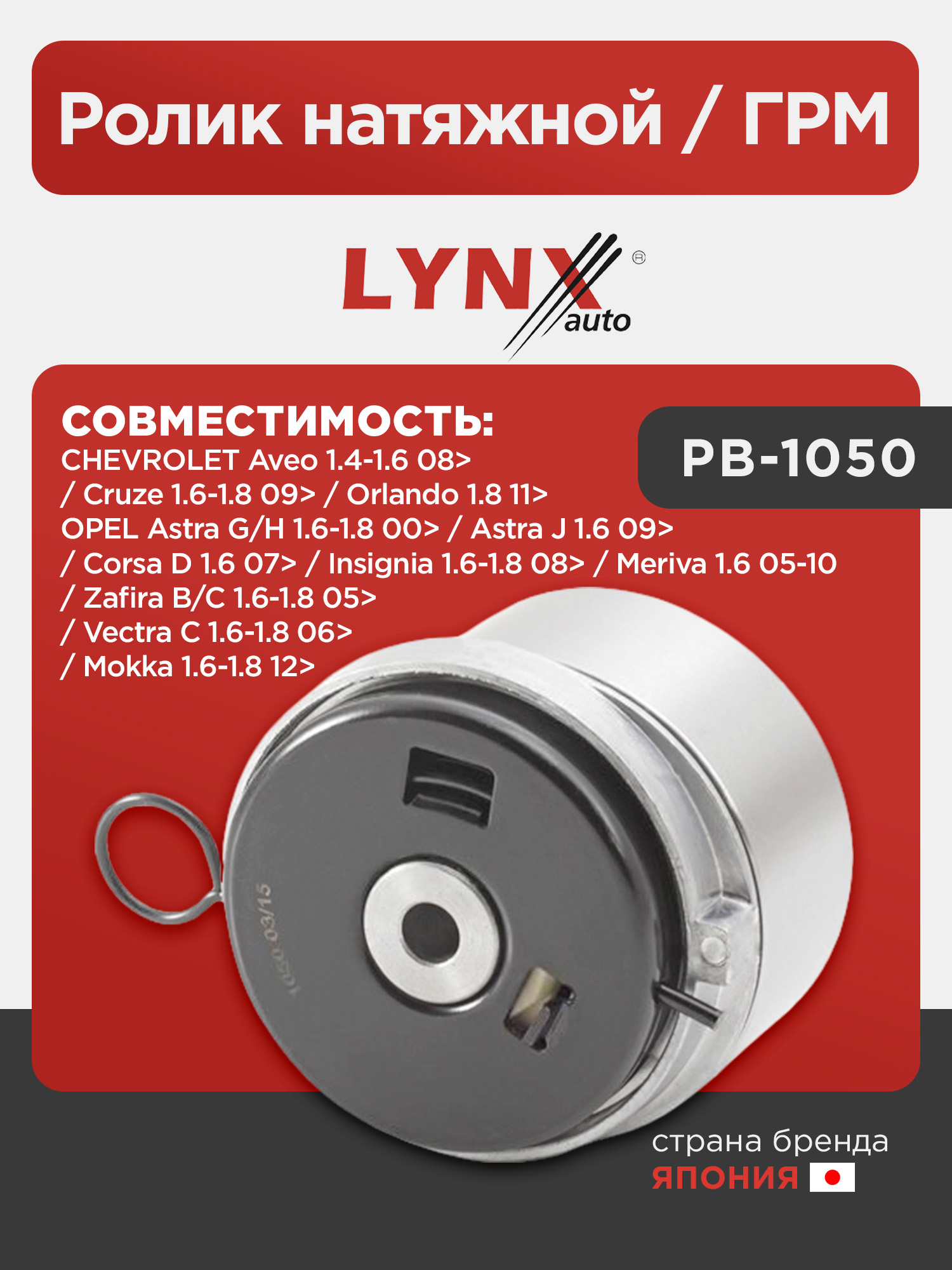 Ролик натяжной / ГРМ LYNXauto PB-1050. Применение: CHEVROLET Aveo 1.4-1.6 08> / Cruze 1.6-1.8 09> / Orlando 1.8 11>, OPEL Astra G/H 1.6-1.8 00> / Astra J 1.6 09> / Corsa D 1.6 07> / Insignia 1.6-1.8 08> / Meriva 1.6 05-10 / Mokka 1.6-1.8 12> / Vectra C 1.6-1.8 06> / Zafira B/C 1.6-1.8 05>.