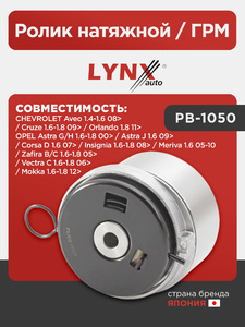 Ролик натяжной / ГРМ LYNXauto PB-1050. Для: Chevrolet, Шевроле, Aveo(Авео) 1.4-1.6 08> / Cruze(Круз) 1.6-1.8 09> / Orlando(Орландо) 1.8 11>, Opel, Опель, Astra(Астра) G/H 1.6-1.8 00> / Astra(Астра).