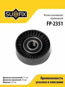 Ролик натяжной/приводной SUFIX FP-2351. Применение: CHEVROLET Niva 1.7 02>, FIAT Doblo 1.6 01>, LADA Granta 1.6 11>/Kalina II 1.6 13>, VOLVO S60 I 2.4D 01-10/S80 I 2.4D 01-06/XC70 2.4D 02-07/XC90 2.4D-3.0D 02>.
