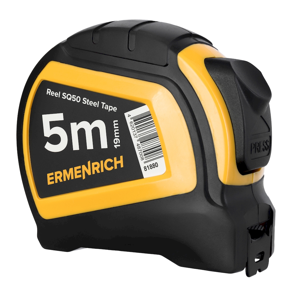 Измерительная рулетка Ermenrich Reel SQ50 — практичный и надёжный инструмент для повседневного использования как в быту, так и на профессиональной стройплощадке. Её 5-метровая лента из матовой стали позволяет легко выполнять замеры мебели, дверных и оконных проёмов, строительных материалов и других объектов среднего размера. Ширина полотна составляет 19 мм, что обеспечивает устойчивость при выдвижении и точность считывания показаний.