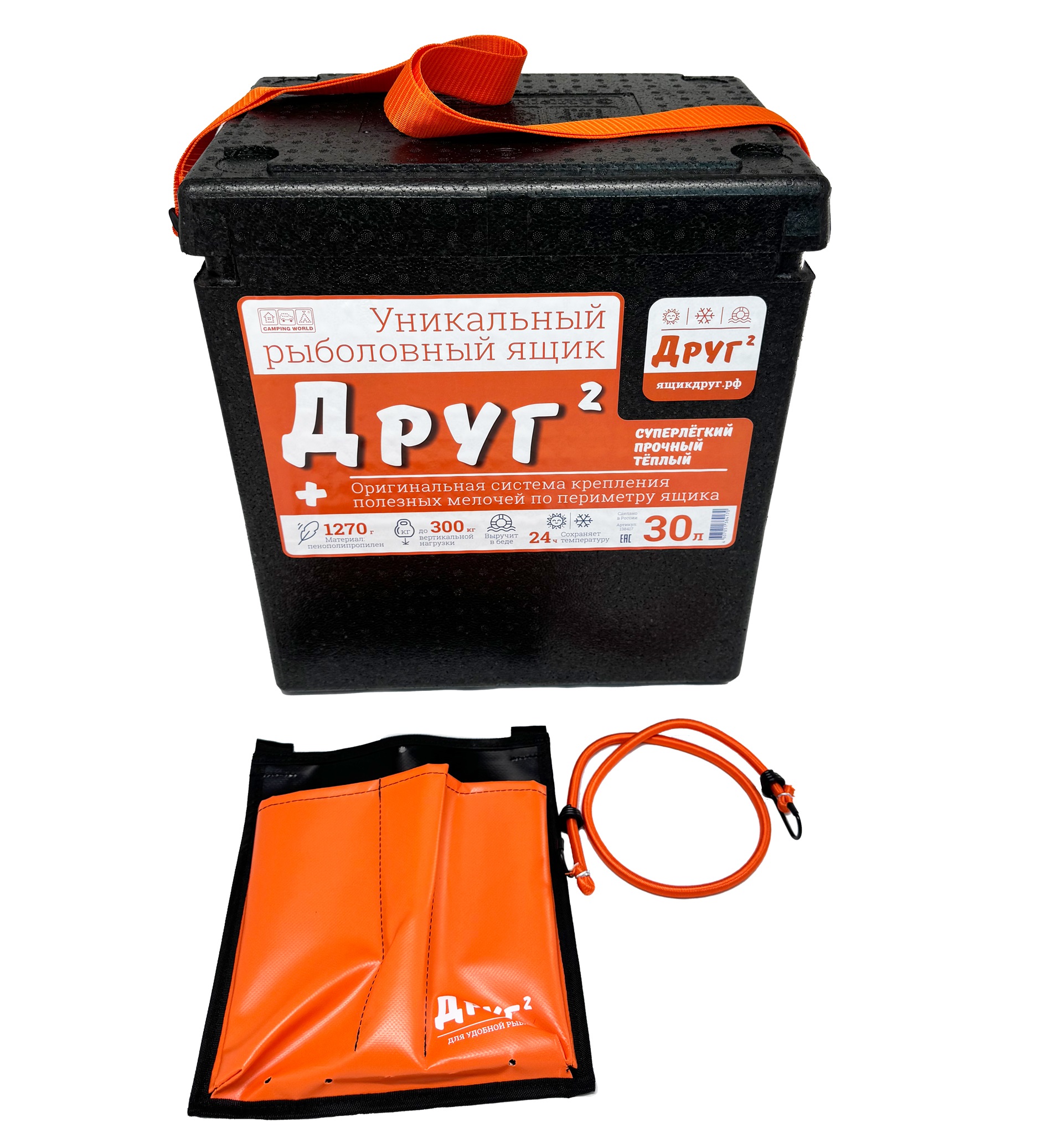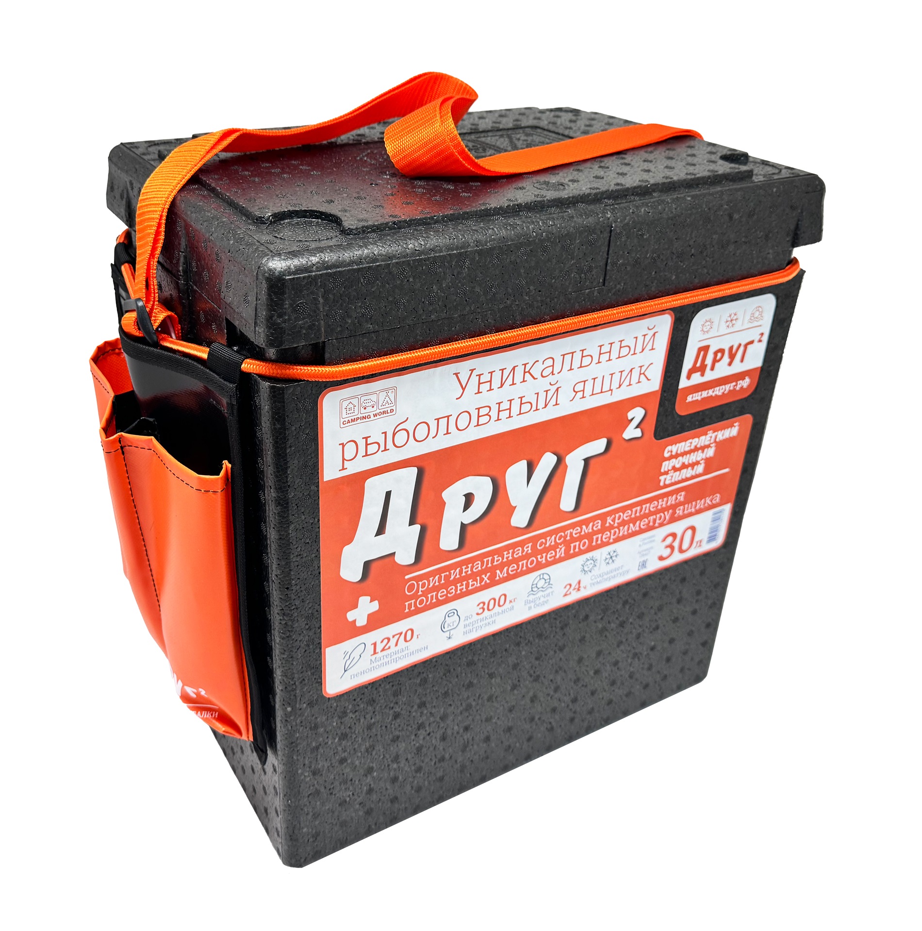Рыболовный ящик Camping World "Друг-2" 30 л черный (в комплекте резинка, карман и самоспасатель)