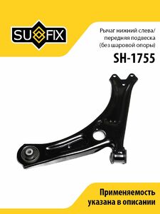 Рычаг нижний L / Перед. подв. (Без шаровой опоры) SUFIX SH-1755. Применение: SKODA Octavia II(1Z) 04-13 / Superb II(3T) 08-15 / YETI(5L) 09-17, VW Caddy 04>.