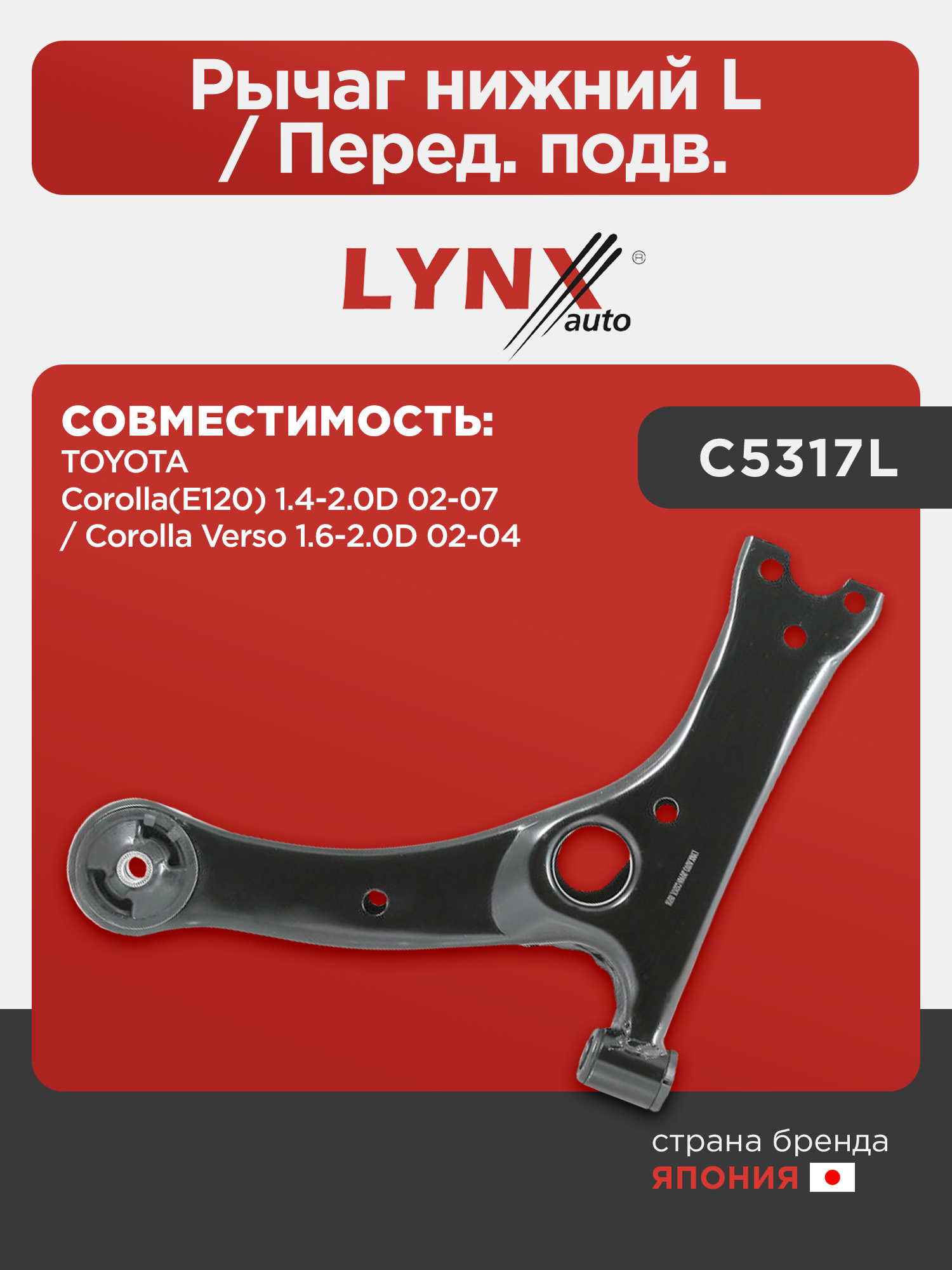 Рычаг нижний L / Перед. подв. LYNXauto C5317L. Для: Toyota, Тойота, Corolla(Корола)(E120) 1.4-2.0D 02-07 / Corolla(Корола) Verso 1.6-2.0D 02-04.