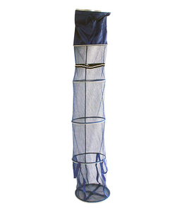 Садок изготовлен из нейлоновой нити с PVC-покрытием, что обеспечивает прочность, устойчивость к истиранию и долговечность в воде.